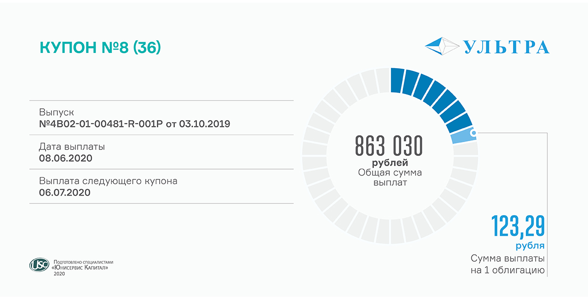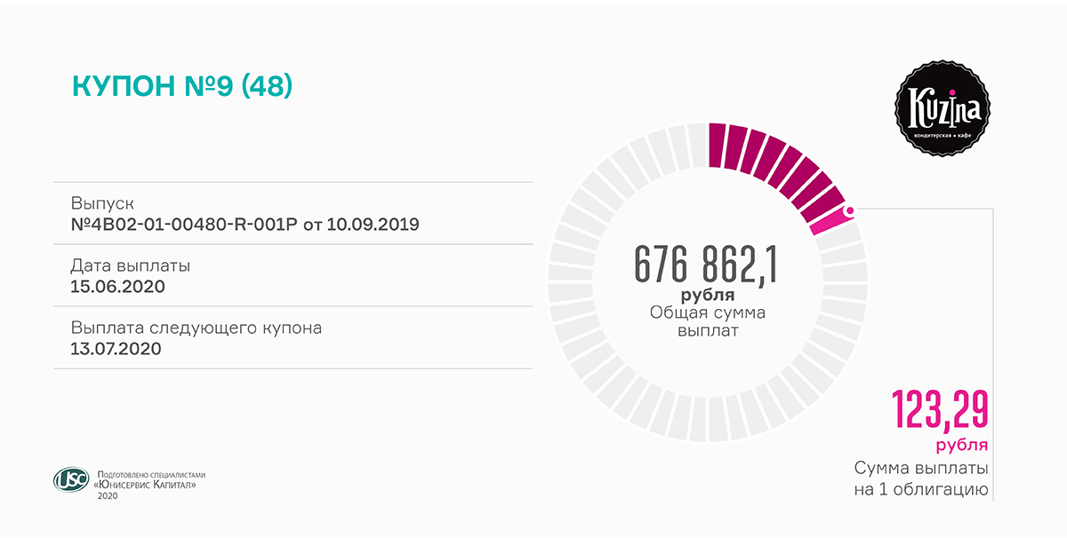 Очередная дата выплаты пришлась на праздничный день — 12 июня и была перенесена на ближайший понедельник. Сегодня в НРД компания перечислит 676,9 тыс. рублей за 5490 облигаций, находящихся в обращении.