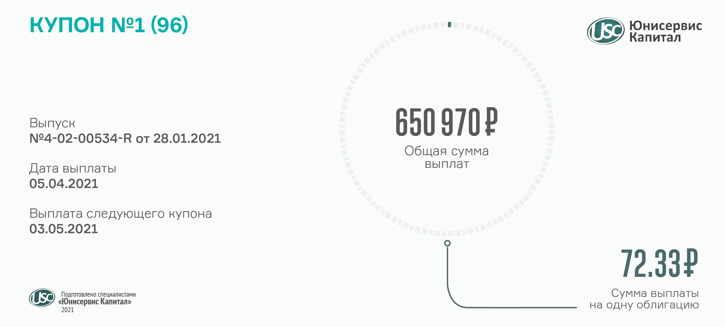 По выпуску действует фиксированная ставка 12,5% годовых. Ежемесячный доход инвесторов составляет 10,27 руб. за одну облигацию номинальной стоимостью 1 тыс. руб. Общая сумма выплат по купону — 4 108 000 руб.
