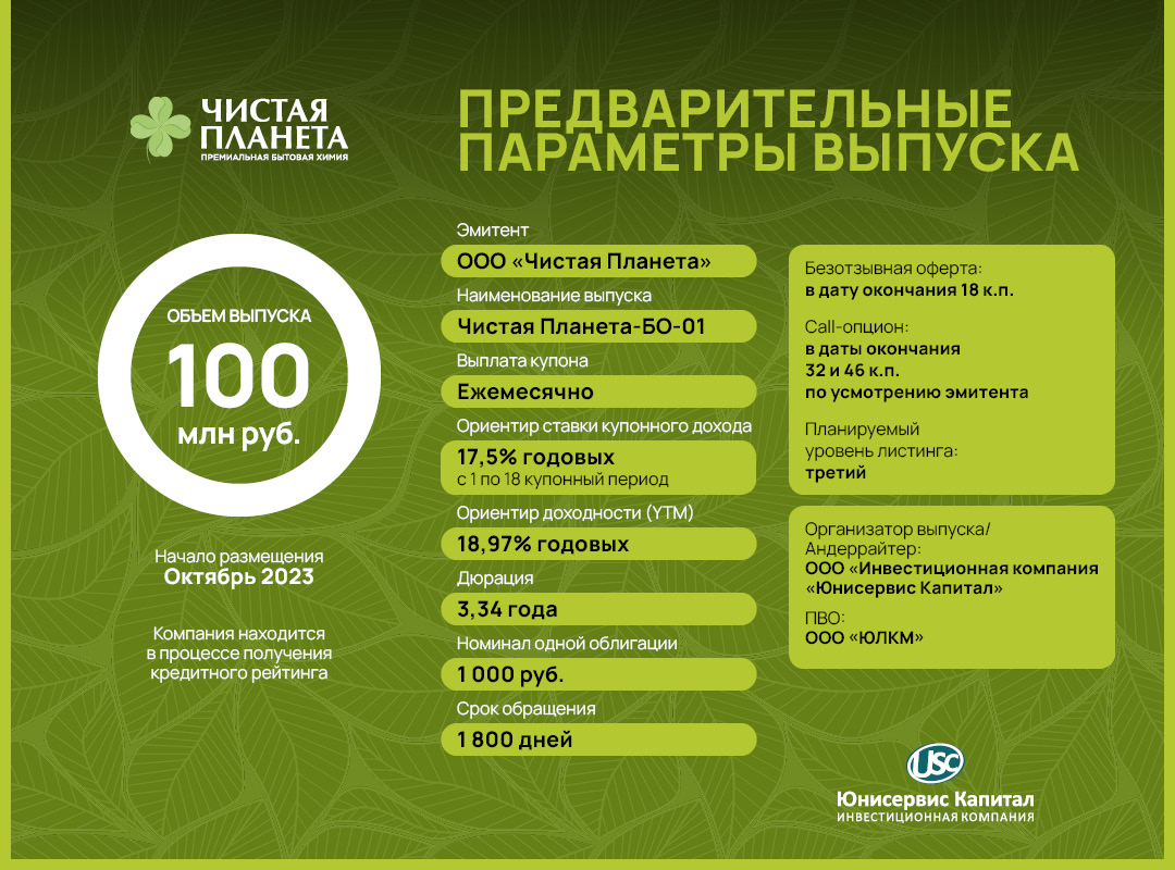 Напомним, ООО «Чистая Планета» — производитель премиальной бытовой химии и средств гигиены. Это компания, которой удалось создать первую в России сеть розничных магазинов, специализирующуюся на продаже данных категорий товаров на розлив. Данная бизнес-модель позволяет продавать качественную продукцию по доступным ценам, поскольку эмитент экономит на производстве и маркетинговом оформлении упаковки. А также это часть ESG-философии предприятия, которая основа на двух ключевых принципах: