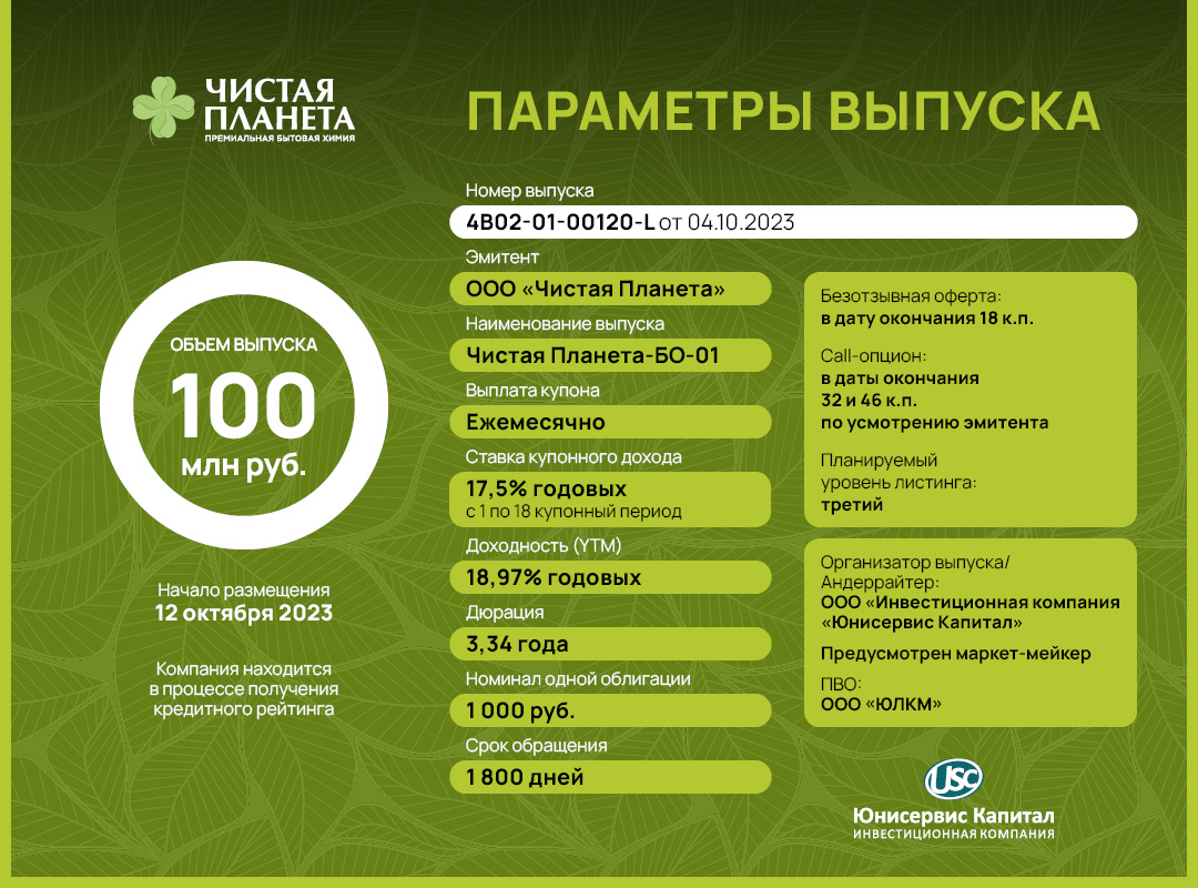 4 октября Московская Биржа зарегистрировала дебютный выпуск облигаций ООО «Чистая Планета» и присвоила ему номер № 4B02-01-00120-L от 04.10.2023 г. Сегодня, 5 октября, в 13:00 (МСК), сразу по окончанию прямого эфира с эмитентом, начнется сбор предварительных уведомлений на участие в первичном размещении.