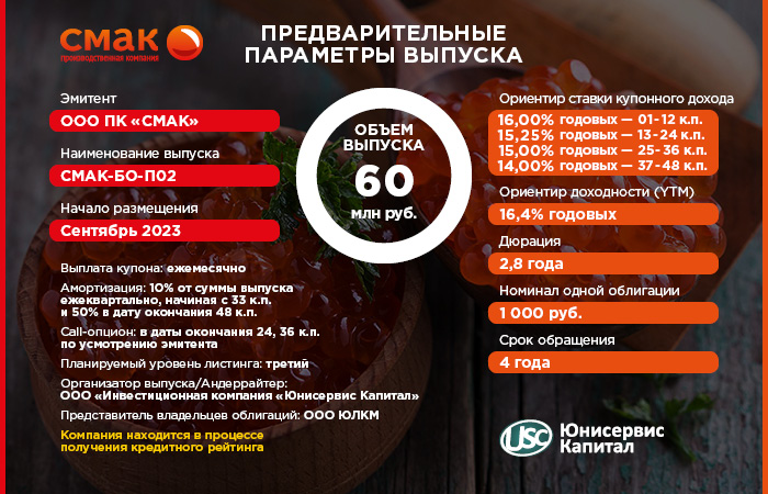 Напомним, что ООО ПК «СМАК» готовится разместить второй выпуск биржевых облигаций, зарегистрированный Московской Биржей под номером 4B02-02-00564-R-001P от 01.09.2023, уже в текущем месяце.