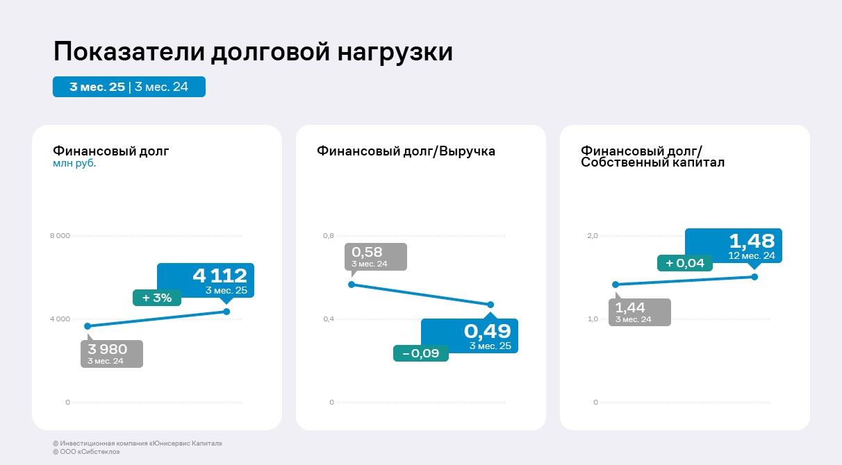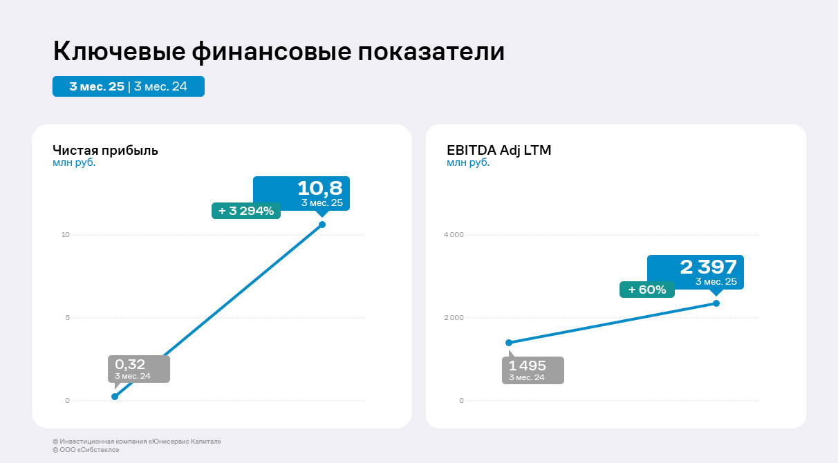 По итогам 3 месяцев 2025 года «Сибстекло» увеличило выручку на 51% — до 2,3 млрд руб., что обусловлено индексацией цен, проведенной в первом квартале 2025 года и ростом выпуска продукции. Валовая прибыль увеличилась в 2 раза и достигла 828 млн руб.
