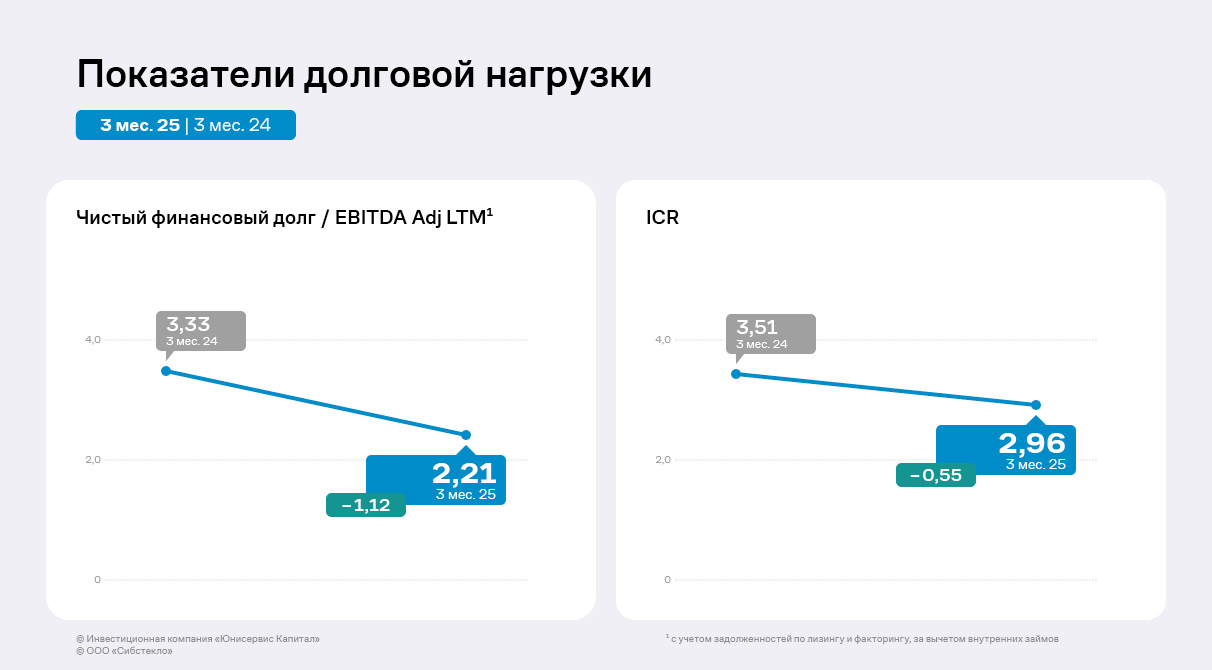 Коэффициент покрытия процентов (ICR) снизился на фоне существенного роста процентных расходов, однако по итогам 3 месяцев 2025 года он также сохранен на комфортном для компании уровне.