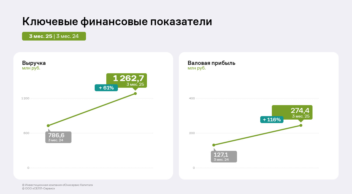 По итогам 3 месяцев 2025 года выручка ООО «СЕЛЛ-Сервис» выросла на 61%, а чистая прибыль на 48% относительно аналогичного периода прошлого года. Валовая прибыль и EBITDA Adj LTM также ощутимо увеличились — в два и шесть раз соответственно.