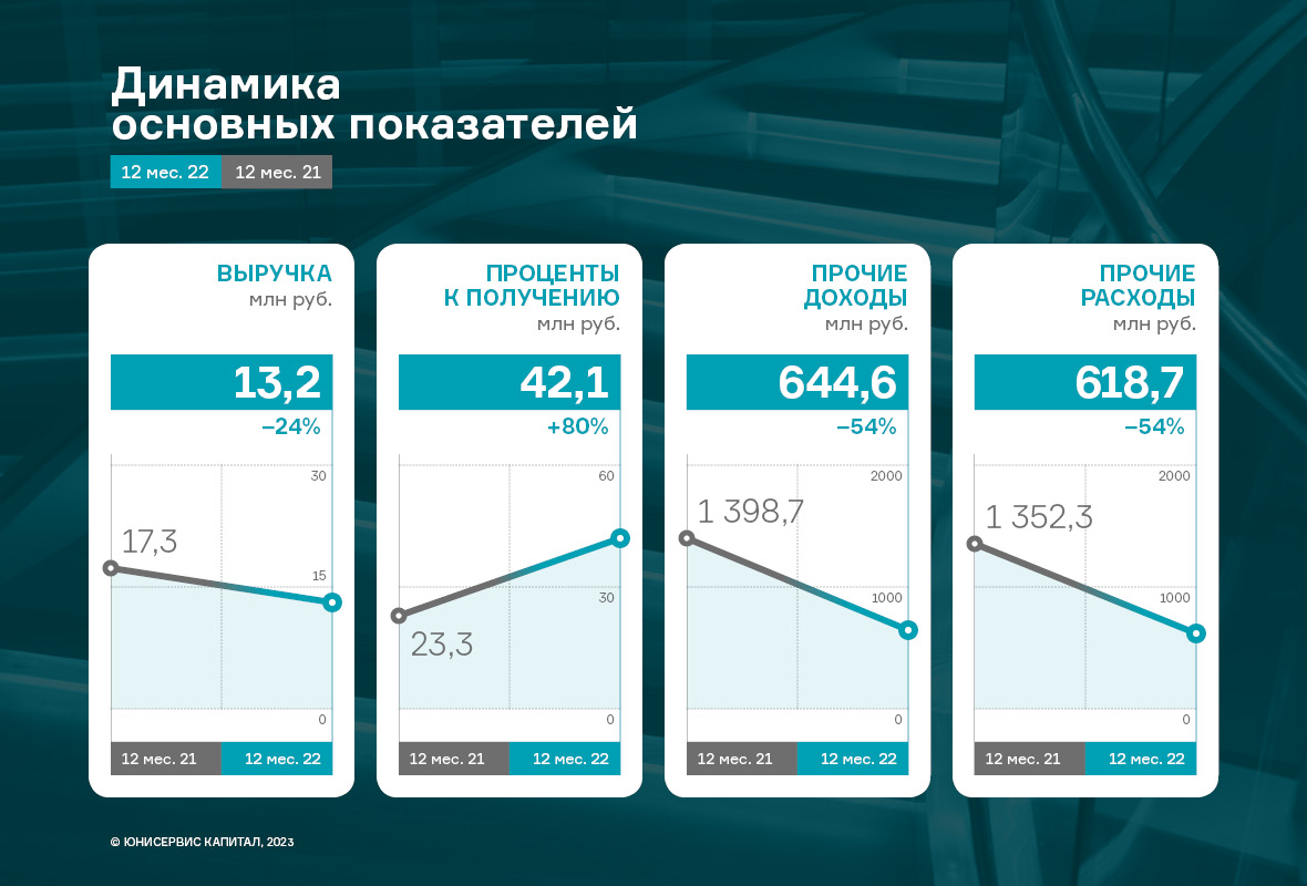 По итогам 12 мес. 2022 прочие доходы ООО «Юнисервис Капитал», в основе которых лежит торговый оборот ценными бумагами, снизились на 53,9% в сравнении с аналогичным периодом прошлого года (АППГ). Частично снижение вызвано сложным состоянием самого рынка, частично усилением риск-политики компании, которая была нацелена на минимизацию потерь вызванных падением котировок. Часть капитала, которая ранее использовалась в обороте с ценными бумагами, была переориентирована на выдачу займов третьим лицам по актуальным рыночным ставкам. Сам оборот по займам, в соответствии с ПБУ, не отражается в отчете о прибылях и убытках, но отражаются проценты к получению, которые в сравнении с АППГ выросли на 80,4% — до 42 089 тыс. руб.
