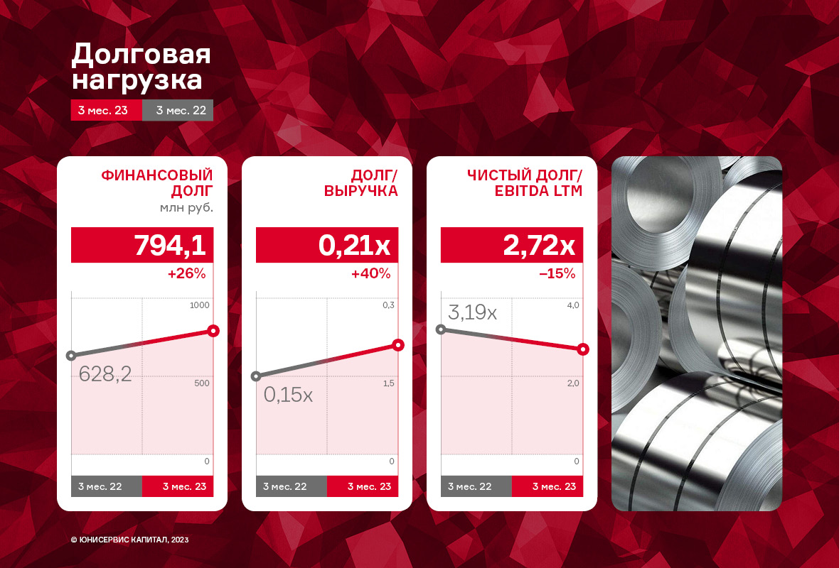 В 1 квартале 2023 года на фоне колебаний цен на металл выручка ООО «НЗРМ» несколько снизилась относительно 3 мес. 2022 года. Зато эмитенту удалось увеличить показатели чистой прибыли и EBITDA LTM на 72% и 43% к АППГ. Подробнее о причинах разноплановой динамики — в нашем аналитическом отчете.