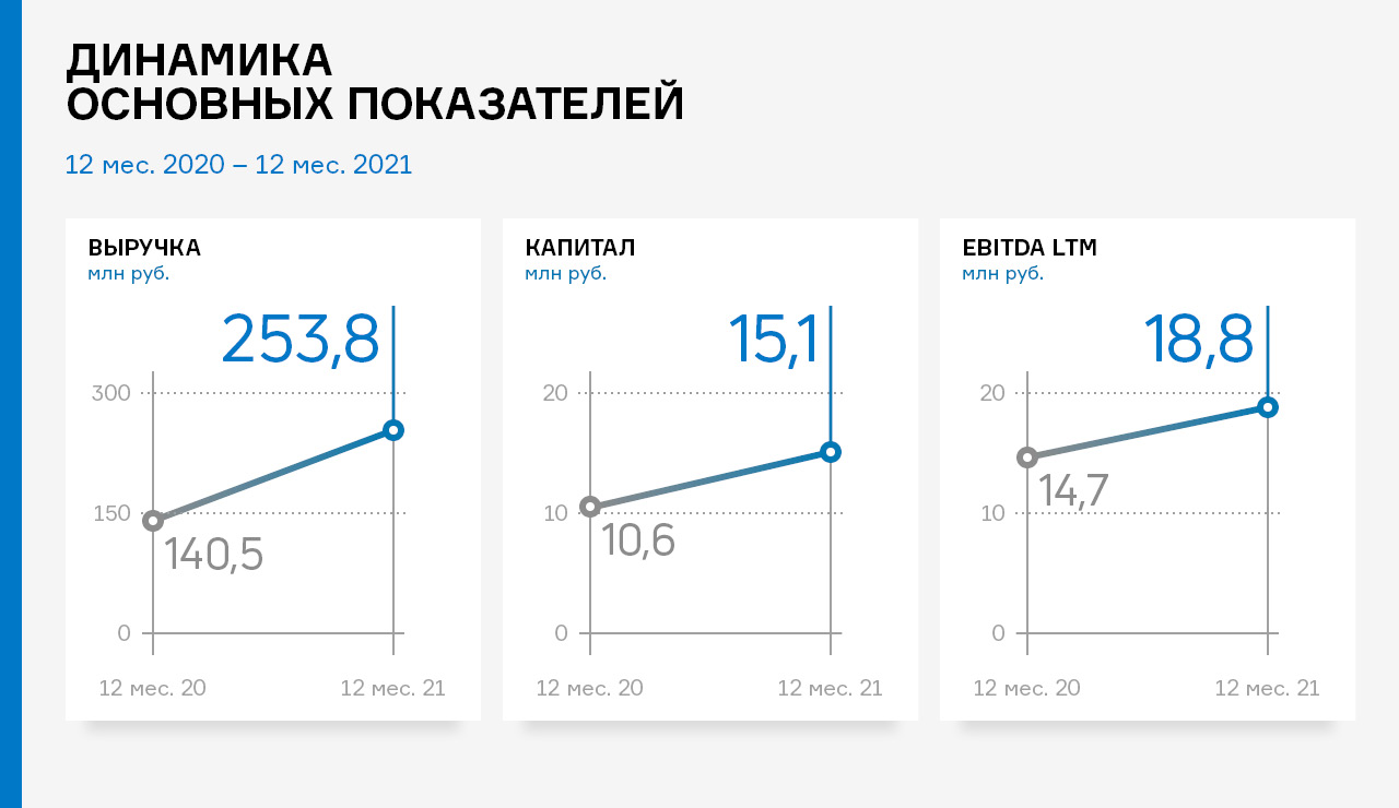По итогам работы деятельности эмитента за 12 месяцев 2021 г. выручка составила 253,8 млн рублей, что выше уровня аналогичного периода прошлого года на 80,7%. Значительный рост выручки обусловлен увеличением объемов производства и реализации продукции.