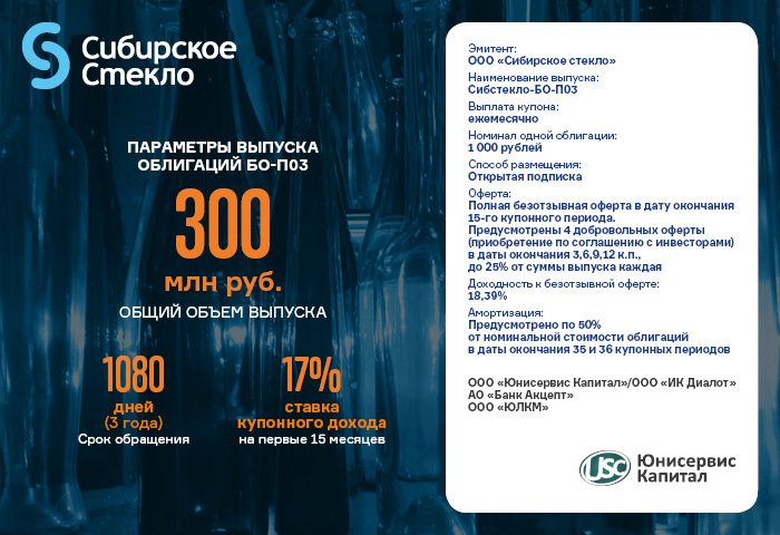 • Для повышения ликвидности ООО «Сибстекло» также предусмотрело 4 добровольных оферты. Они будут проводиться раз в 3 месяца — в даты окончания 3,6, 9 и 12 купонных периодов. Объем выкупа — до 25% от общей суммы выпуска каждая.