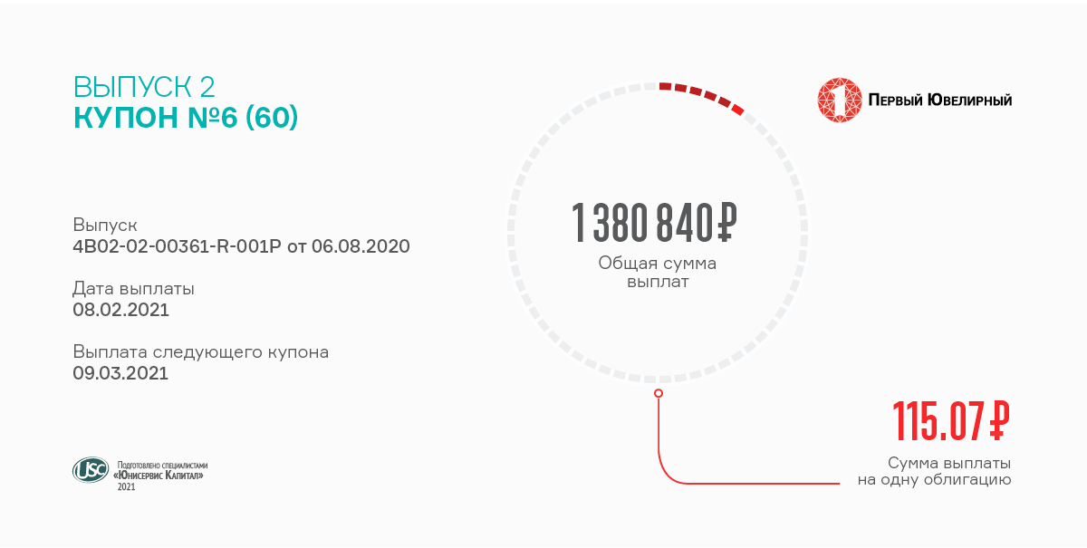 Общая сумма выплат облигационерам составляет 676 862,1 руб. из расчета 123,29 руб. за одну облигацию номиналом 10 тысяч. Купоны начисляются по ставке 15% годовых, установленной до ближайшей оферты, которая состоится в сентябре 2021г.