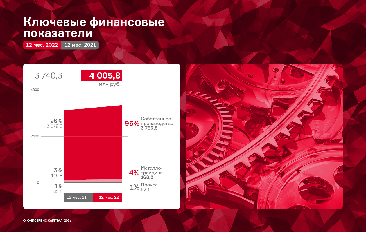 Как и в прошлые отчётные периоды, основным направлением деятельности эмитента остается собственное производство продукции, доля которого в выручке в 2022 году составила 94,5%. Трейдинг — оптовая купля и продажа листового металлопроката — является дополнительным направлением и занимает в выручке эмитента не более 4–5%.