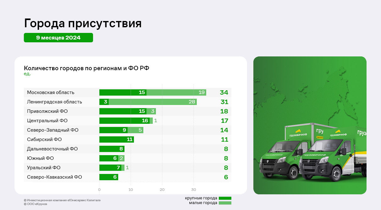В III квартале эмитент расширил географию присутствия, открыв новый филиал в Перми. Для запуска представительства «Грузовичкоф» нанял новых сотрудников, арендовал и оборудовал офис, и провел ряд маркетинговых активностей в регионе для привлечения клиентов в сервис. Сейчас эмитент представлен уже более чем в 150 городах России.