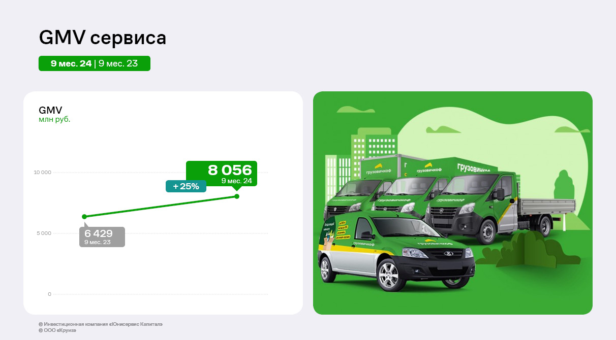 GMV сервиса за 9 месяцев 2024 года прирос к АППГ на 25%, составив более 8 млрд руб. При этом в разбивке по направлениям виден существенный рост услуг по контрактным перевозкам (доставки для DIY сетей и интернет-магазинов – более 100% относительно 9 месяцев 2023 года). Услуги грузового такси показали наибольший рост к АППГ в странах СНГ (+90%), в регионах России он достиг +14%. В Санкт-Петербурге и Москве рост GMV составил более 10%.