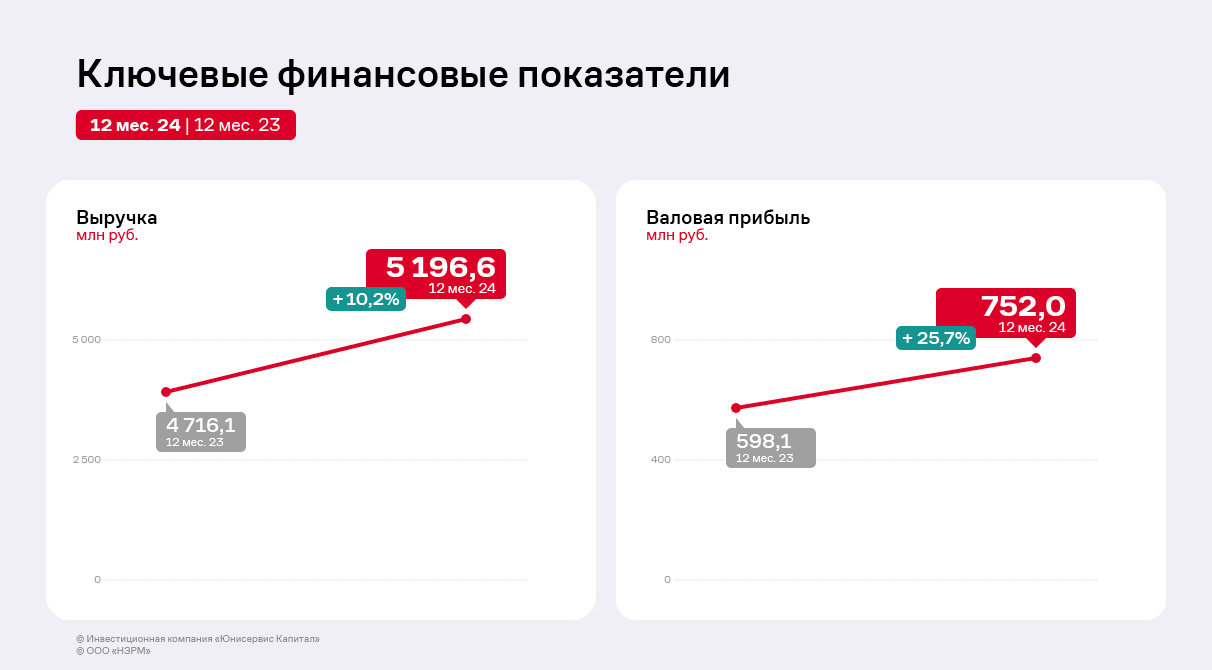 По итогам работы в 2024 году ООО «НЗРМ» продемонстрировал положительную динамику финансово-хозяйственной деятельности. Выручка за 12 мес. 2024 года составила 5 196,6 млн. руб., увеличившись на 10,2% по сравнению с аналогичным периодом прошлого года. Валовая прибыль выросла существеннее — на 25,7% к АППГ, так как темпы наращивания выручки превышают рост себестоимости, несмотря на увеличение себестоимости, в том числе за счёт систематического повышения оплаты труда сотрудников. Эмитент вкладывает ресурсы в автоматизацию производственных процессов в целях снижения издержек, что позволяет ему сохранять положительную динамику финансовых результатов из года в год и указывает на грамотную ценовую политику.