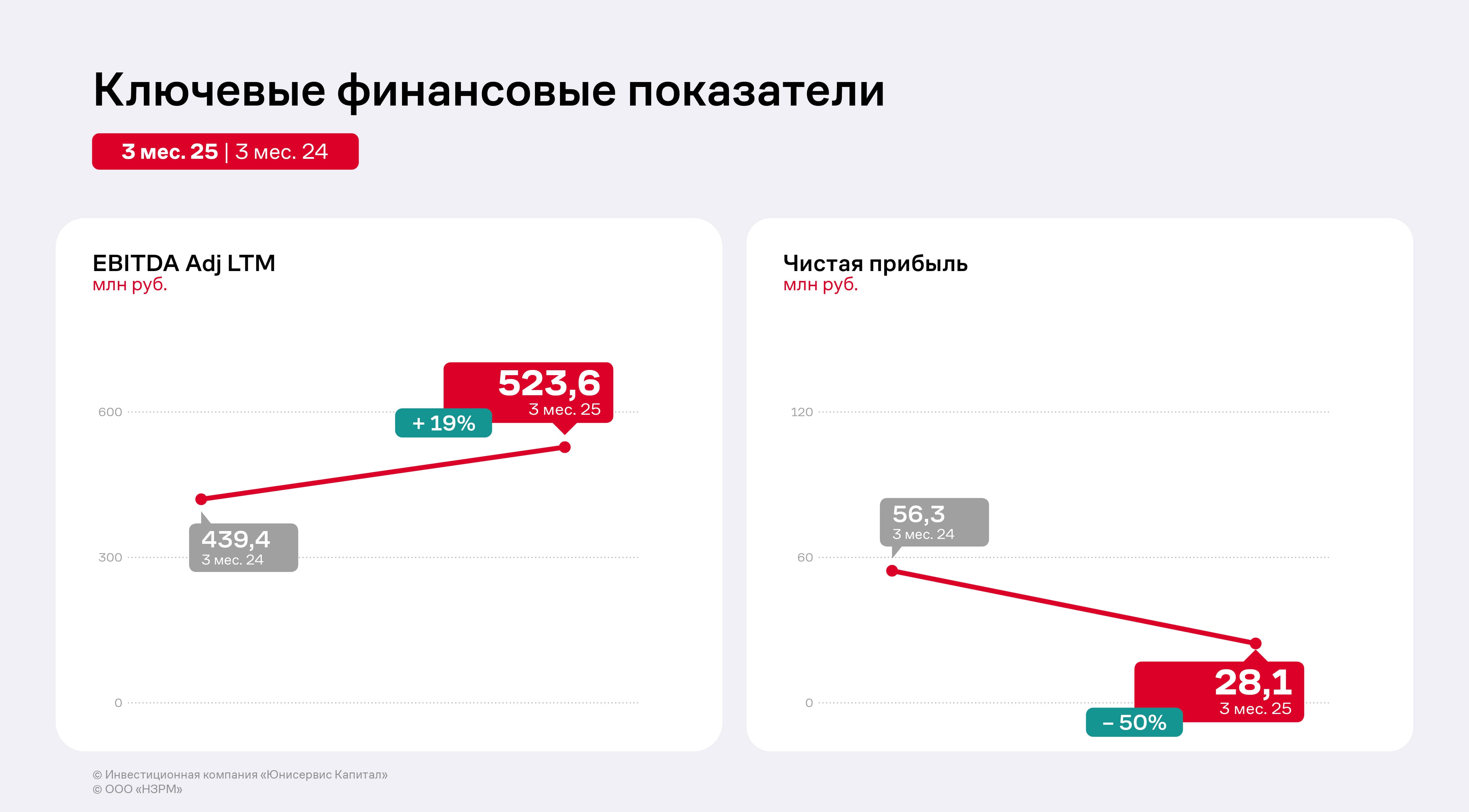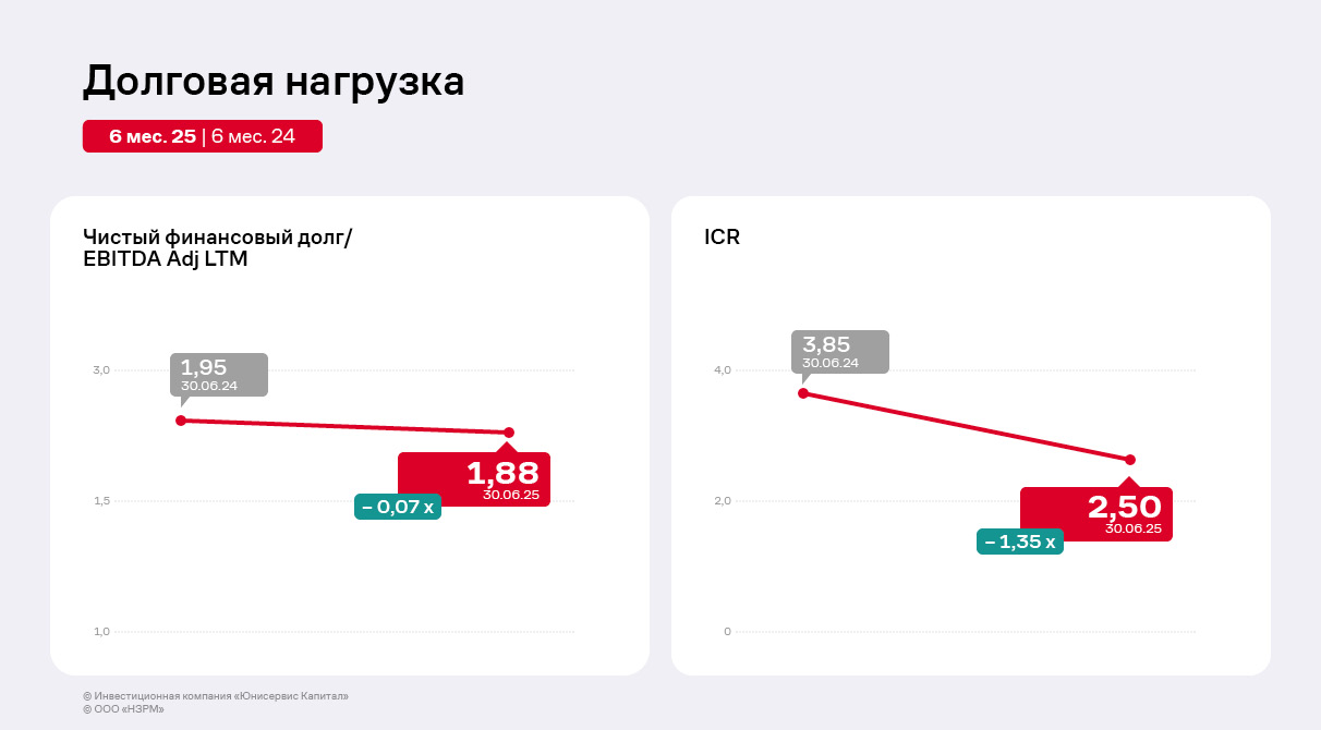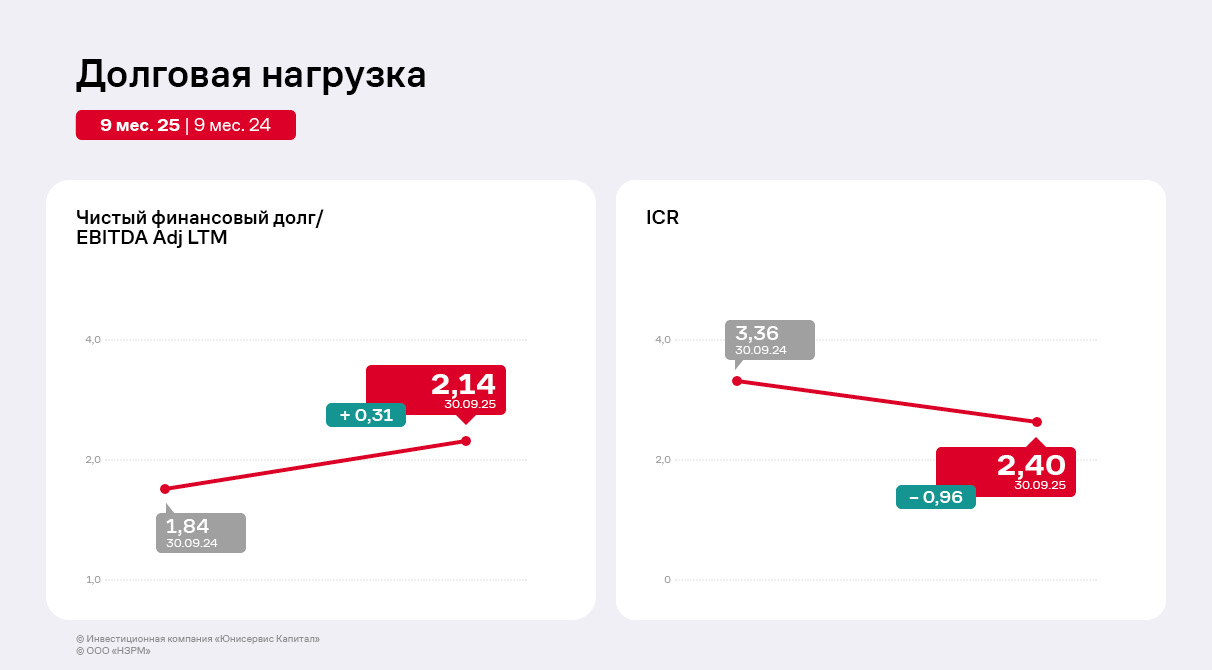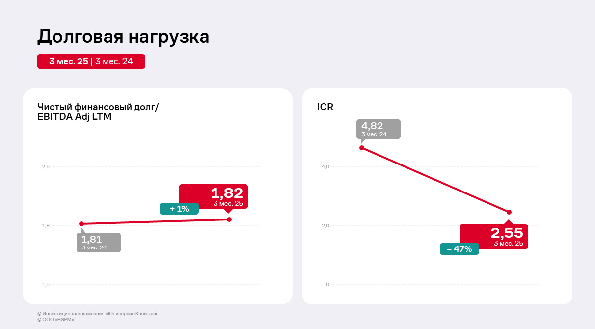 Снижение себестоимости поспособствовало дальнейшей положительной динамике показателя EBITDA Adj LTM, рост которого составил 8% относительно АППГ. Чистая прибыль ООО «НЗРМ» сократилась на 49% в связи с увеличением управленческих расходов и процентов к уплате. Напомним, что с конца 2024 г. компания начала нанимать сотрудников для второго производственного цеха, а также заключила договоры на открытие новых кредитных линий для приобретения сырья и материалов для работы на новом оборудовании.