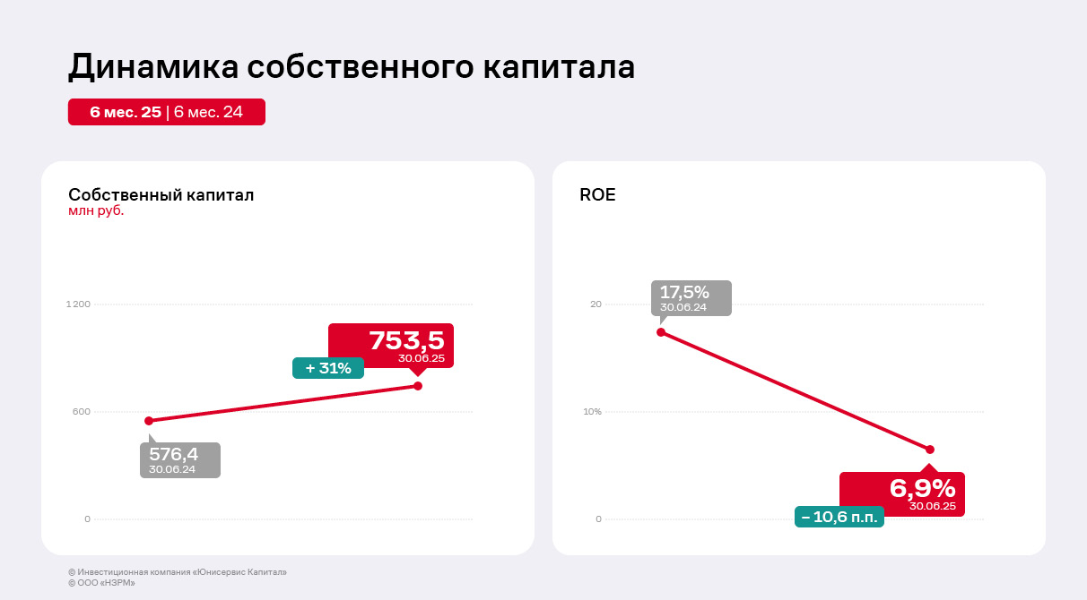 Рентабельность собственного капитала (ROE) в отчётном периоде находится на уровне 6,9%, снизившись относительно АППГ на 10,6 п.п. вследствие сокращения чистой прибыли относительно АППГ.