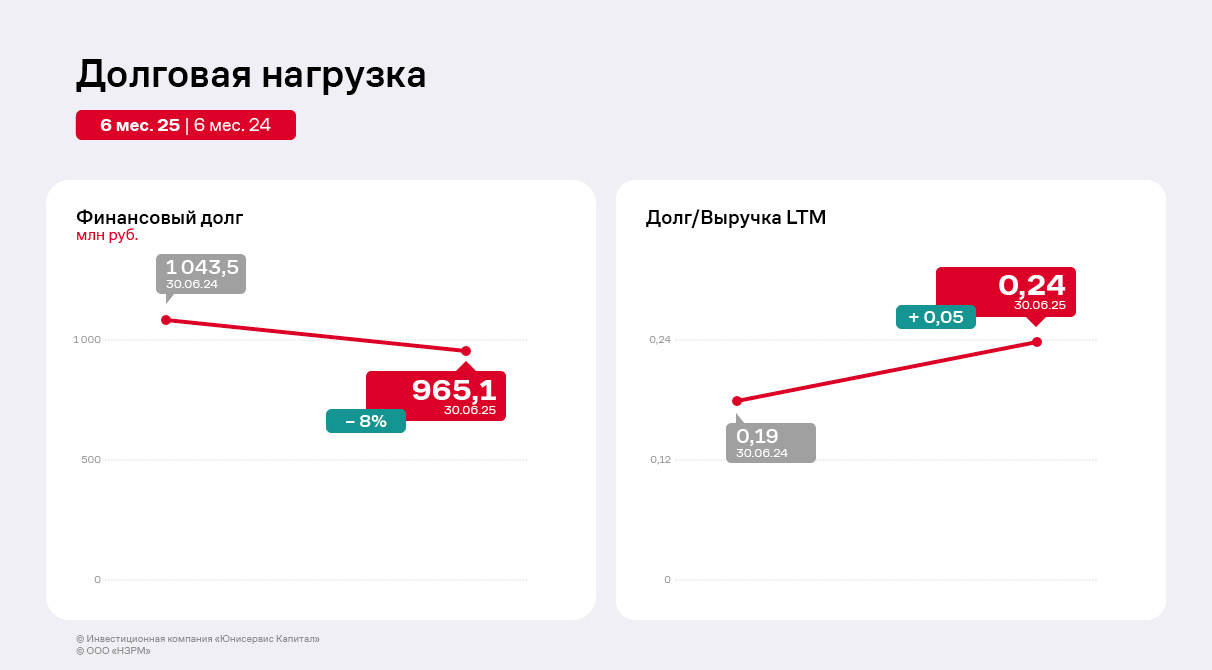 Основным источником финансирования деятельности эмитента остаются заёмные средства. Финансовый долг на 30.06.2025 г. — 965,1 млн руб., что меньше значений АППГ на 8% преимущественно благодаря частичным досрочным погашениям выпуска НЗРМ-БО-01 по 7,5% ежеквартально, начиная с 30 к. п., и закрытию части кредитных линий. В 2024 г. сумма частичных досрочных погашений составила 24 млн руб., а в первом полугодии 2025 г. — 36 млн руб.