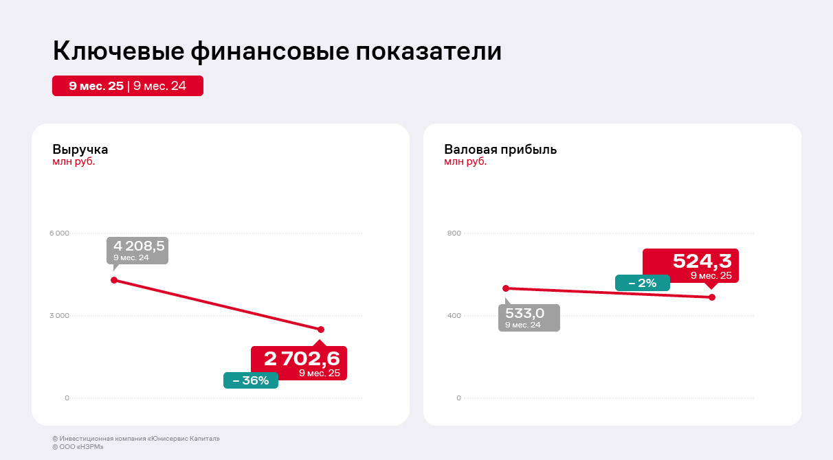 Выручка по итогам 9 месяцев 2025 г. уменьшилась на 36% к АППГ и была зафиксирована на уровне 2 703 млн руб. Сокращение выручки и себестоимости по-прежнему связано с конъюнктурой рынка металла: компания снижает объёмы закупа и переработки сырья для других предприятий, в частности, для энергетической отрасли. Это решение руководство ООО «НЗРМ» приняло для концентрации на более перспективных направлениях.