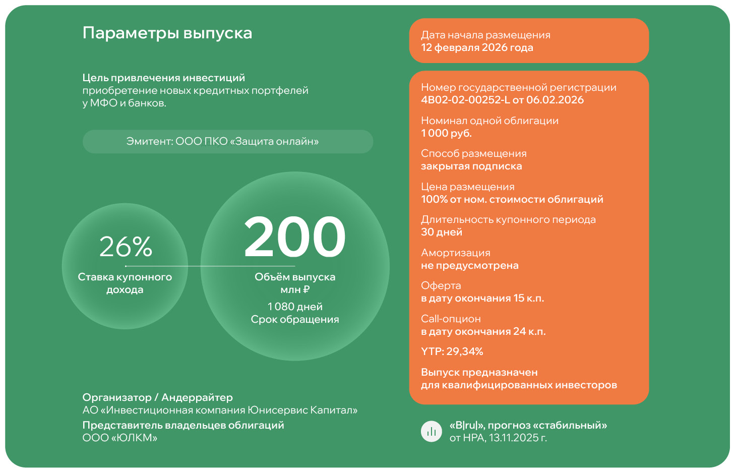 В Решении о выпуске ценных бумаг указаны предварительные параметры дебютного размещения: общий объём 75 млн руб., срок обращения 5 лет среди квалифицированных инвесторов. Дату начала торгов, ориентир ставки купонного дохода, возможные оферты и амортизацию эмитент объявит позже. Московская биржа присвоила выпуску госномер 4B02-01-00495-R от 12.02.2026 и определила уровень листинга – третий.