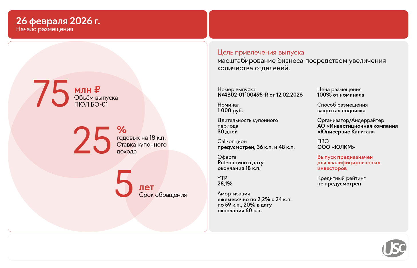 Напомним, Московская биржа присвоила выпуску госномер 4B02-01-00495-R от 12.02.2026. Организатором выпуска выступает АО «Инвестиционная компания Юнисервис капитал», представителем владельцев облигаций – ООО «ЮЛКМ».
