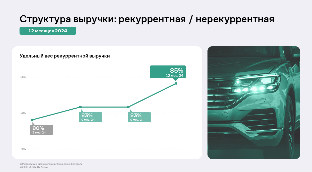 Положительным моментом является рост рекуррентной выручки. С начала 2024 года удельный вес рекуррентной выручки вырос с 80% до 85%, что является зеленым индикатором в развитии компании.