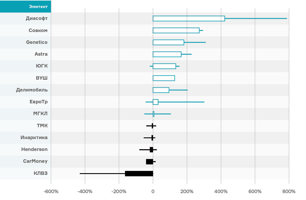 Высокие максимальные котировки были в бумагах Genetico (более 250% роста) и «Евротранс» (почти 100% рост), которые затем упали до уровня +162% и +8% соответственно.