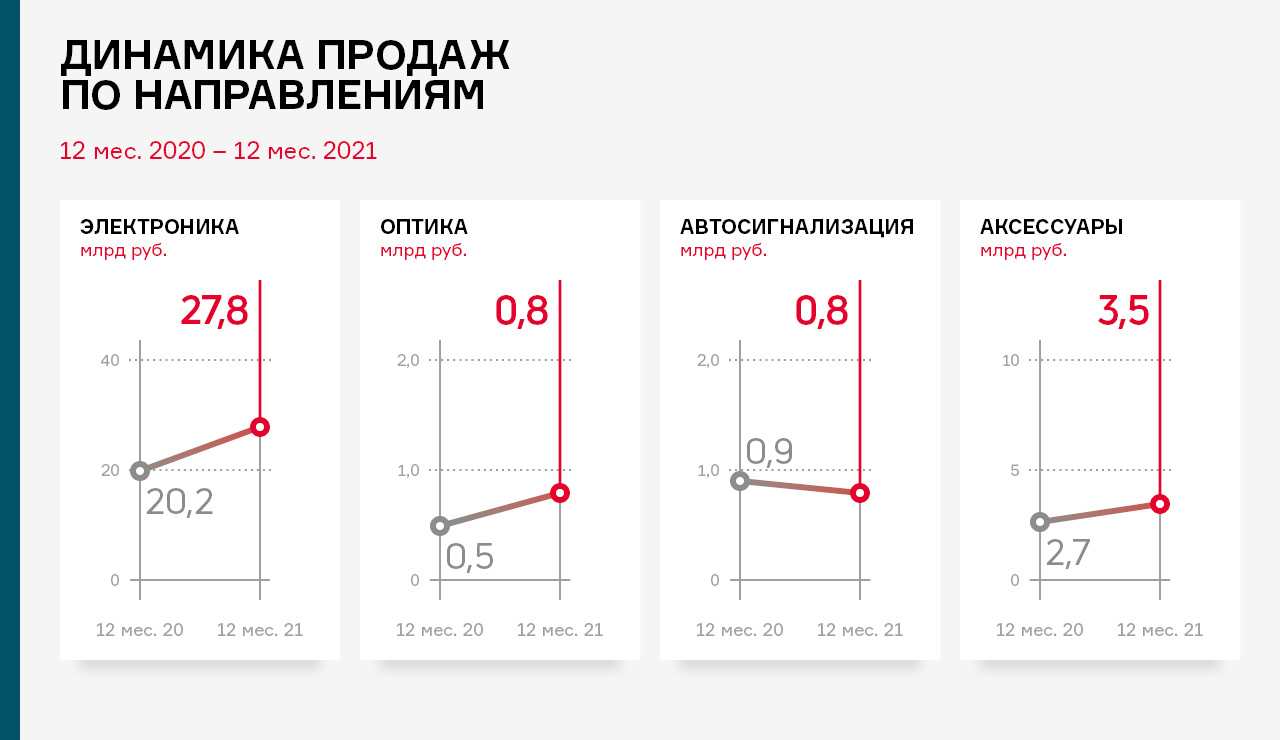 Рост продаж наблюдается в большинстве товарных групп и в первую очередь по группе «Электронная техника», прирост продаж в данном сегменте в 2021 году составил 7,6 млрд руб.
