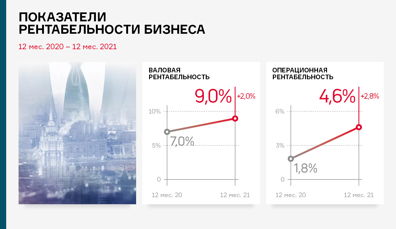 Снижение себестоимости продаж в отчётном году на 3,0% нашло своё отражение в росте рентабельности деятельности эмитента.