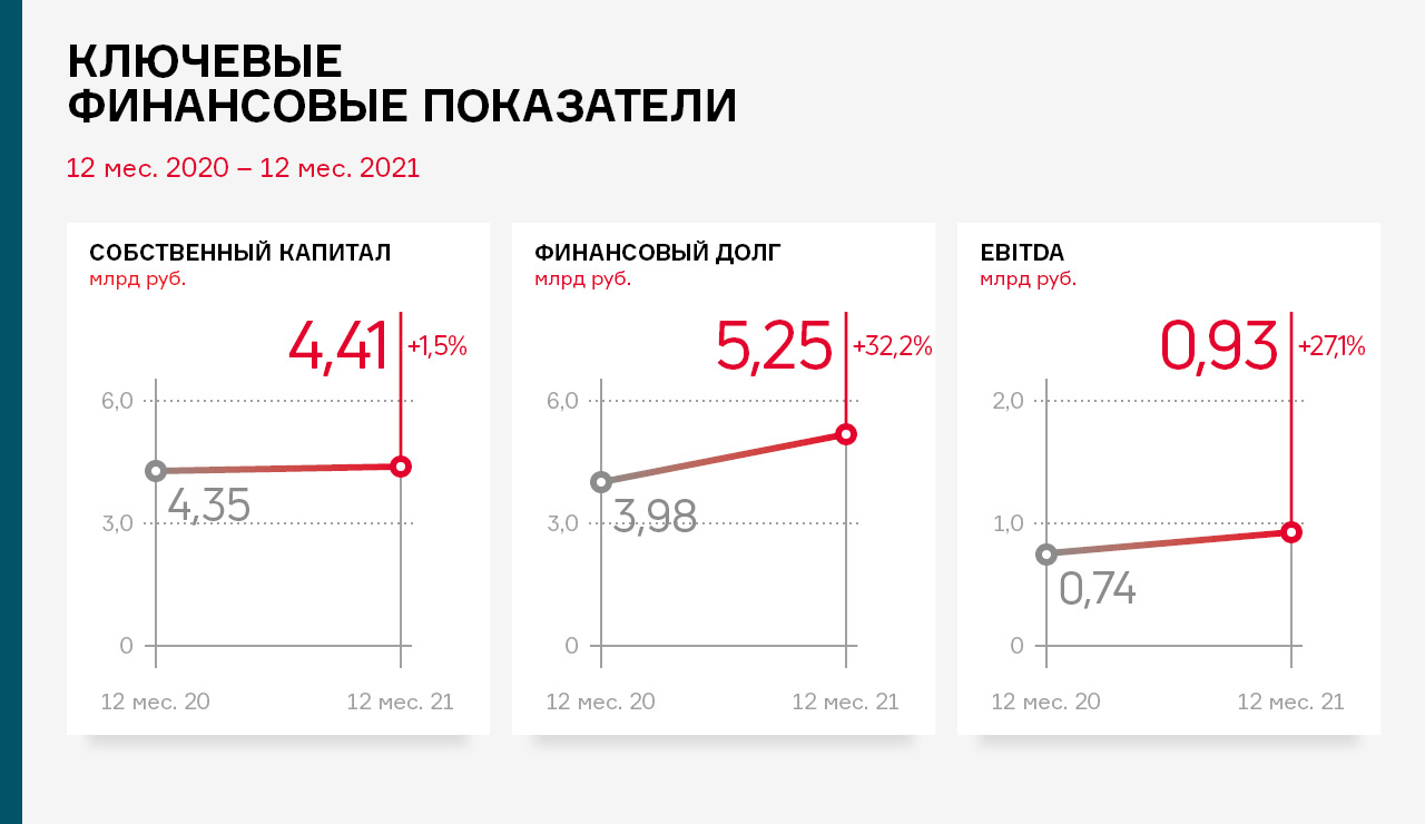 Показатель EBITDA по итогам 2021 года зафиксирован на уровне 934,0 млн руб., что выше значения 2020 года на 27,1% или 199,3 млн рублей.