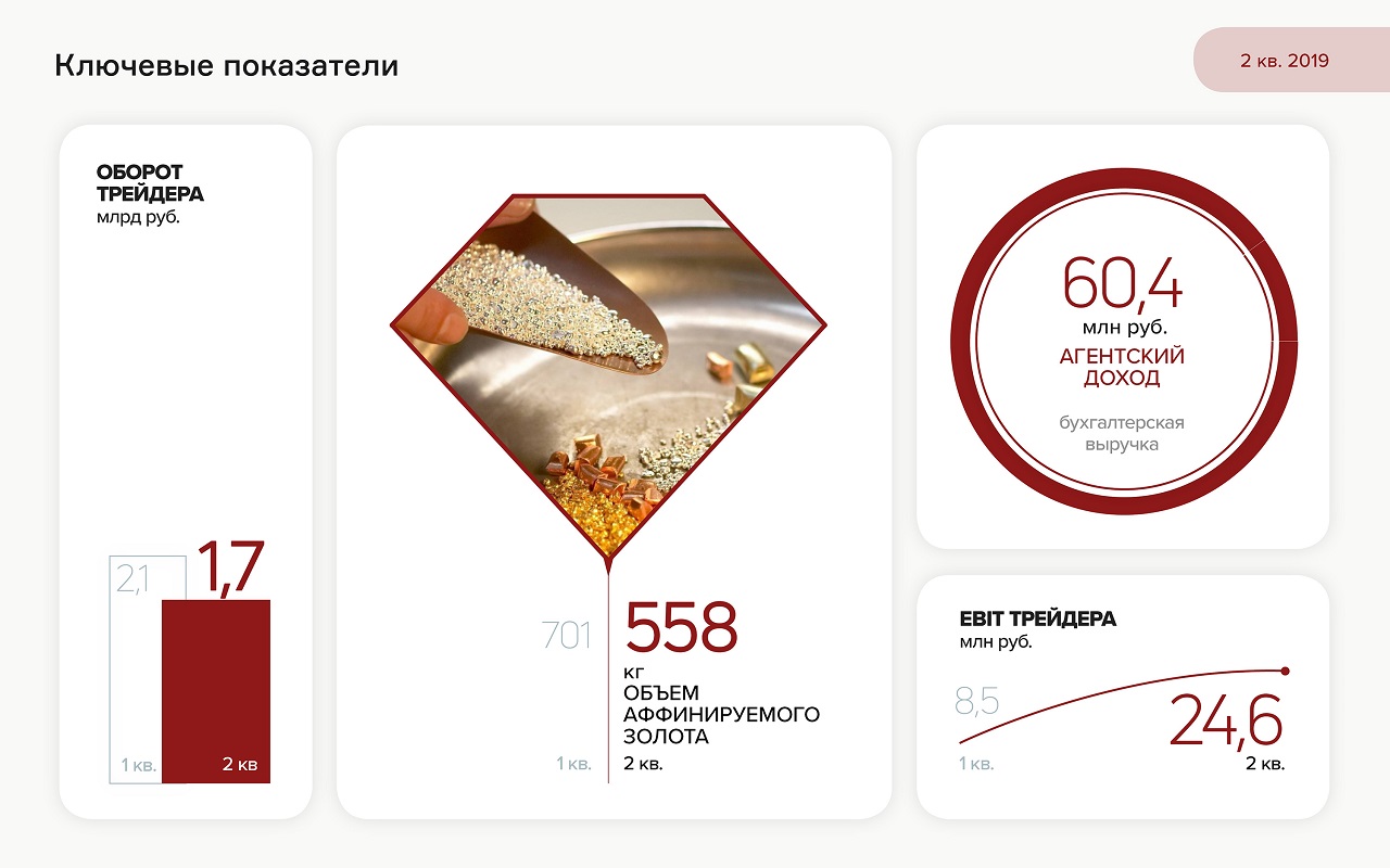 На рост выручки прежде всего оказала влияние высокая активность трейдера: всего за первое полугодие 2019 года компания выполнила поручения от предприятий, потребляющих драгоценные металлы на 1260 кг золота, на сумму более 3,8 млрд руб. Финансовый долг с начала года не изменился и представлен облигационным займом на сумму 116,4 млн рублей.