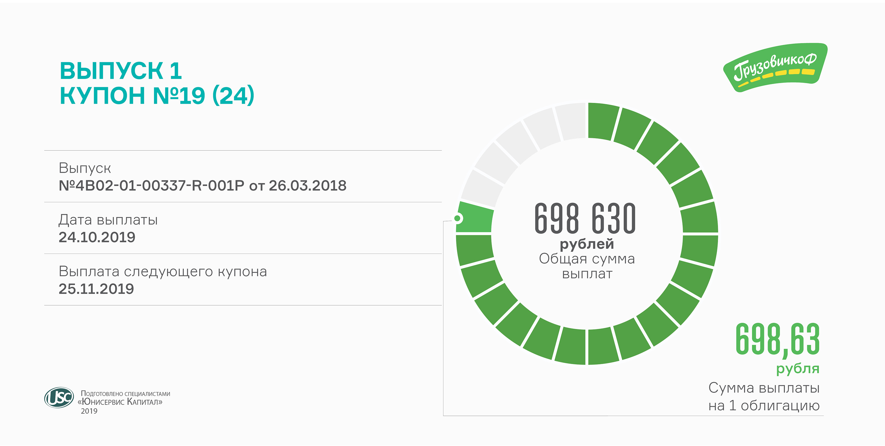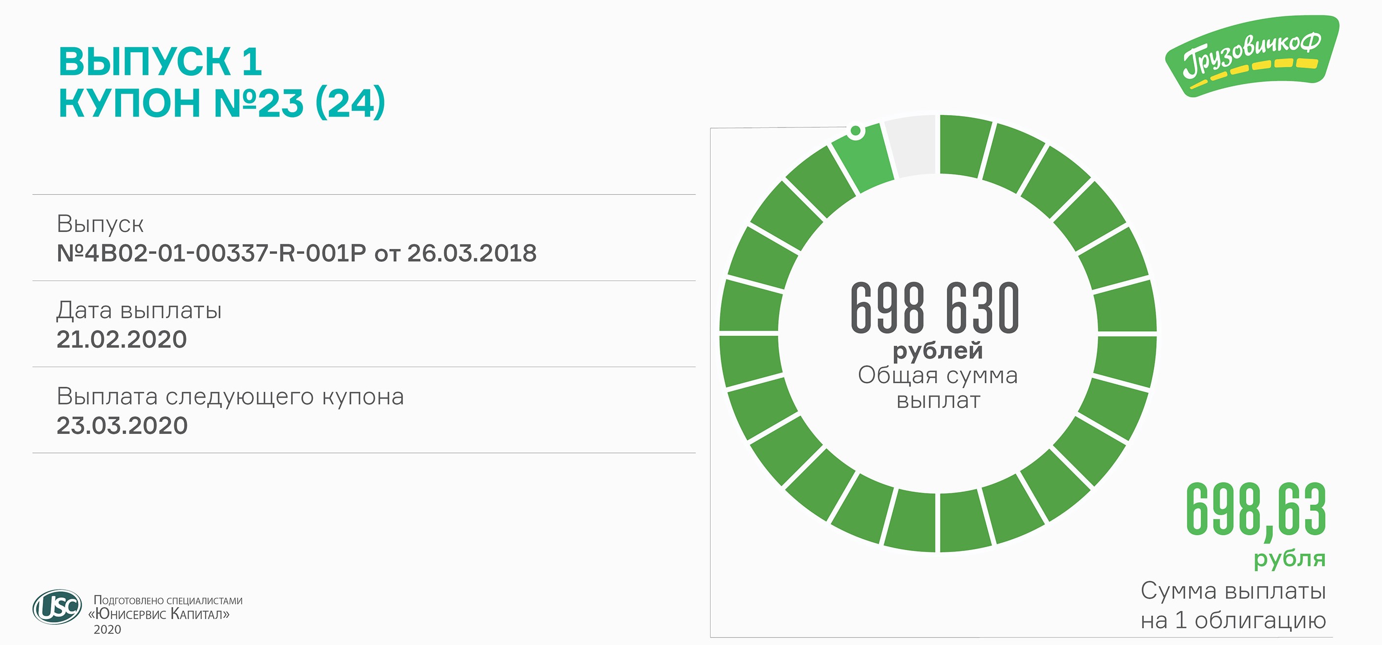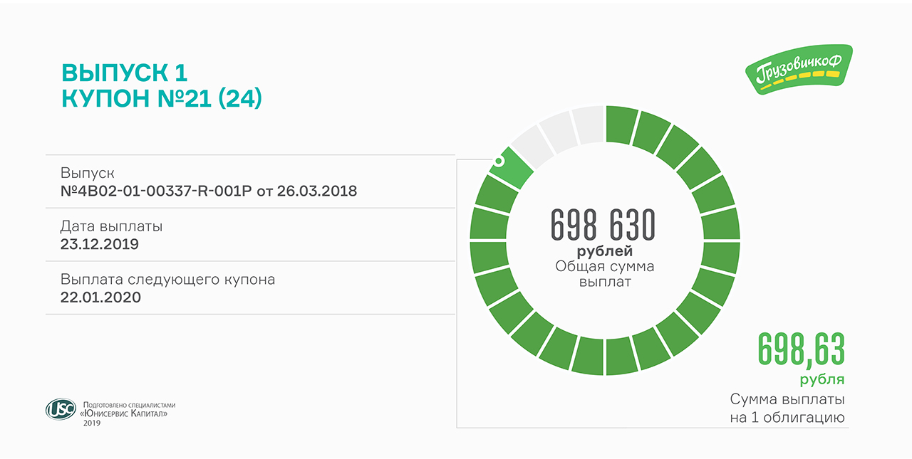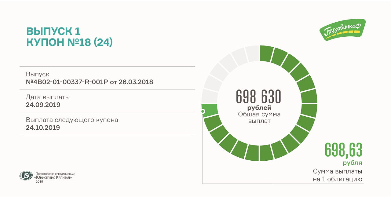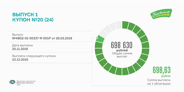 Сегодня выплачено почти 700 тысяч рублей. Размер выплаты на одну облигацию первого выпуска мувинговой компании составляет 698,63 рубля.Ставка купона — 17% годовых.