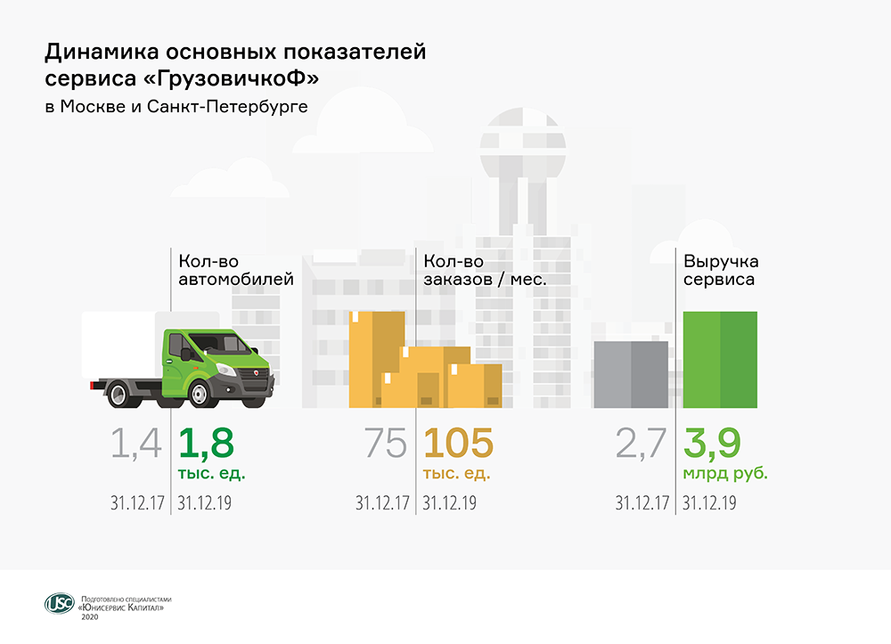 Автопарк, без учета частных водителей, вырос на треть. Увеличение на 40% за 2 года показало ежемесячное количество заказов. Аналогичный рост демонстрирует, по предварительным данным, общая выручка работающих в Москве и Санкт-Петербурге партнеров «ГрузовичкоФ», включая эмитента.