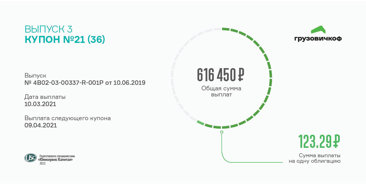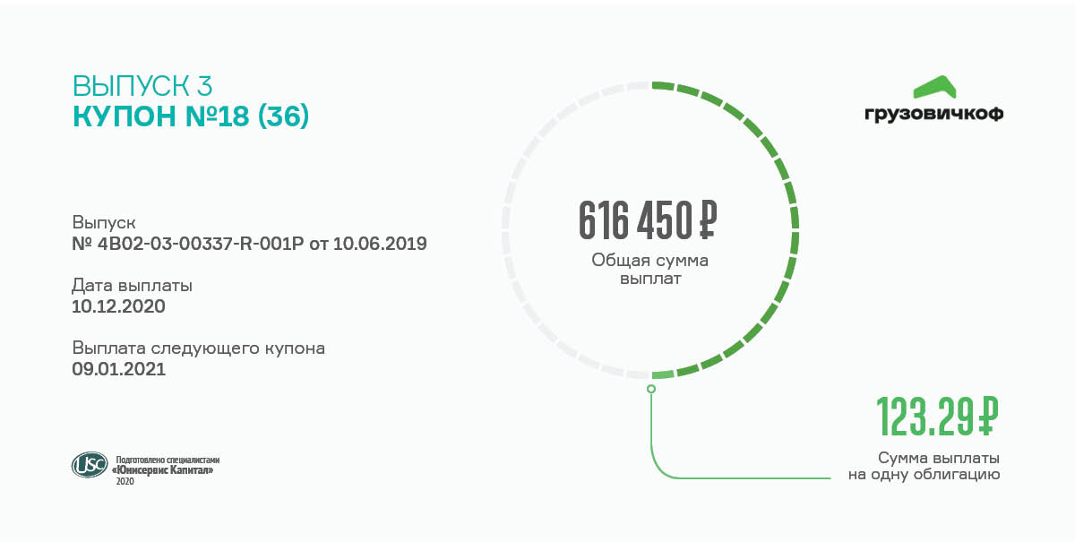 Свой третий по счету выпуск серии БО-П03 (RU000A100FY3) мувинговый сервис «Грузовичкоф» разместил в июне 2019г. Объем эмиссии — 50 млн руб., срок действия — 3 года, разделен на 26 купонных периодов по 30 дней.