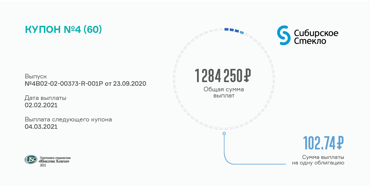 Общий объем дебютного выпуска компании «Сибирское стекло» составил 125 млн рублей, срок обращения — 5 лет, включающий в себя 60 купонных периодов продолжительностью 30 дней. Ставка купона на весь период — 12,5% годовых. По выпуску предусмотрена амортизация: частичное погашение по 5% от номинальной стоимости облигаций с 41 по 60 купонный период. Установлена возможность досрочного погашения по усмотрению эмитента в дату окончания 18, 30 и 42 купонного периода. Облигации ООО «Сибстекло» включены в Сектор Роста Московской биржи.
