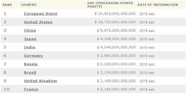 Если вы хотите получить сравнимые данные о ВВП различных стран, то не найти лучшего источника информации, чем THE WORLD FACTBOOK от ЦРУ США.  Приведенная здесь таблица дает нам ВВП, или стоимость всех произведенных продуктов и всех оказанных услуг в стране в течение указанного года. Приведенные цифры основаны на паритете покупательной способности (ППС) относительно США; т.е. они выражены в ценах,...