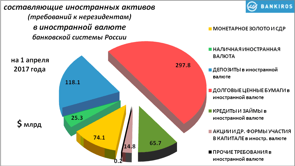 Объем внешних финансовых активов банковской системы в иностранной валюте , которые складываются из ЗВР Банка России и внешних активов банков 2-го уровня в иностранной валюте, составил в конце марта 2017-го $596,1 млрд. Половина их – это иностранные долговые бумаги (в том числе ценные бумаги Казначейства США – “трежерис”). Также много валюты находится на депозитах за границей.