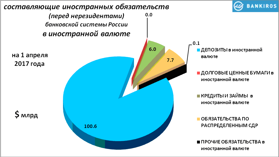 Обязательств банковской системы в иностранной валюте перед нерезидентами – а это внешние инвалютные обязательства ЦБ РФ и банковской системы 2-го уровня в виде депозитов нерезидентов в отечественной банковской системе, обязательств по кредитам из-за рубежа и по распределенным СДР, собственных ценных бумаг в иностранной валюте на руках у нерезидентов – на конец марта 2017-го подсчитано на $114,5 млрд, где главная составляющая – это иностранная валюта нерезидентов на депозитах в российских банках.