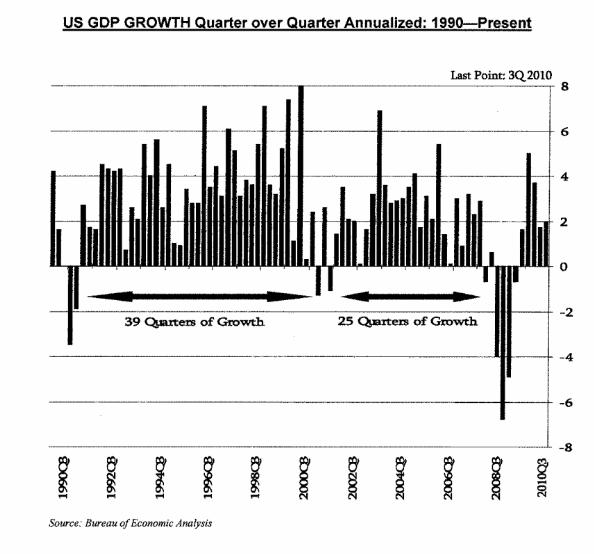 На графике показан поквартальный рост американской экономики (от года к году) с 1990 года.