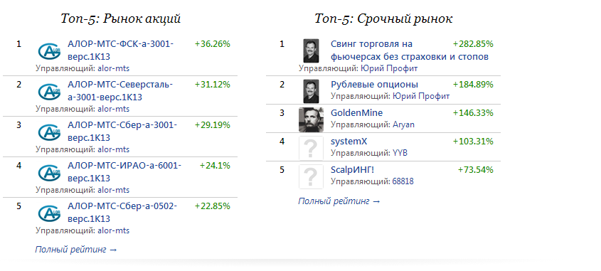 Регистрация на конкурс «Алгоритмус 2014» завершена. Пожелаем всем участникам успехов и подведем итог недели. Девятая неделя конкурса прошла под знаком экспирации месячных опционов на срочном рынке. Динамика изменения индексов держалась всю неделю в узком диапазоне, аналогично можно характеризовать изменение доходностей участников конкурса. Постоянным лидером на рынке акций является управляющий компании Алор, увеличивший доходность до 36,26%. А на срочном рынке доходность стратегии «Свинг торговля на фьючерсах без страховки и стопов» осталась прежней и составляет 282,8%.