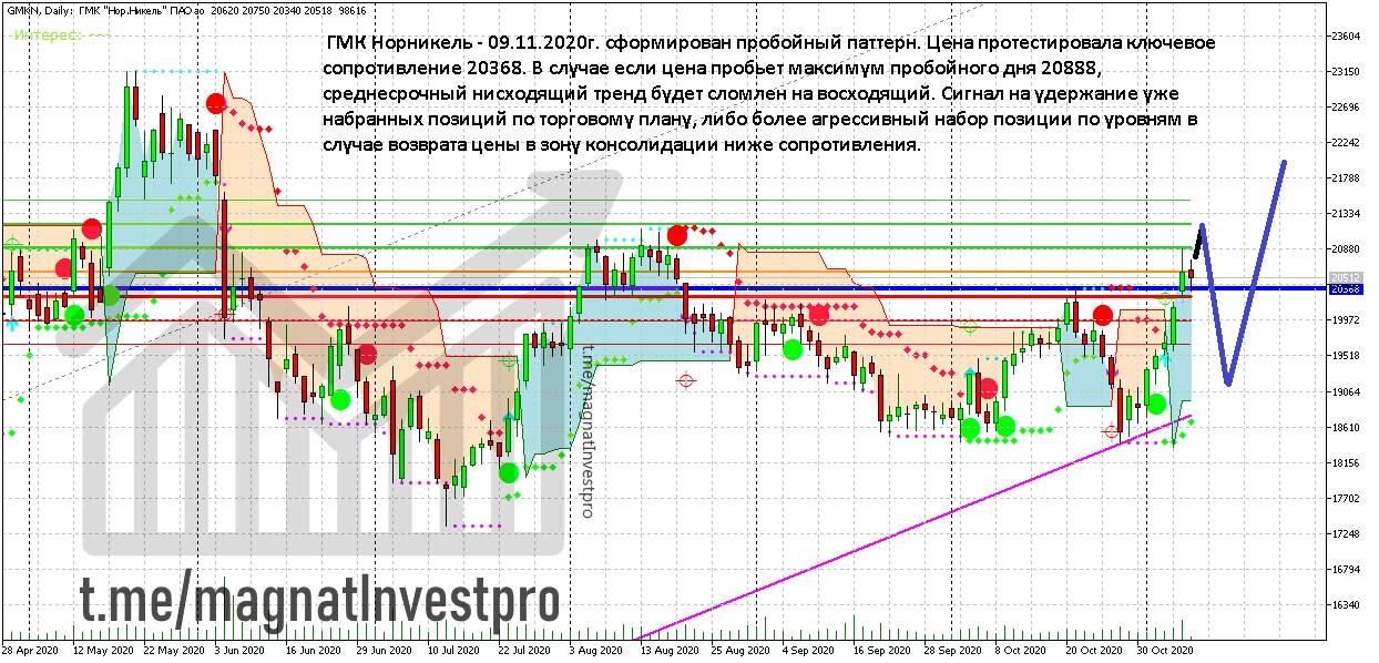 Акции ГМК Норникель - 09.11.2020 года сформировали пробойный паттерн. Цена протестировала ключевое сопротивление 20368. В случае перехая максимума пробойного дня 20888, среднесрочный нисходящий тренд будет сломлен на восходящий. Реализация данного сценария послужит сигналом для долгосрочного удержания уже набранных позиций по торговому плану, либо более агрессивного набора позиции по уровням в случае возврата цены в зону консолидации ниже уровня сопротивления 20368.