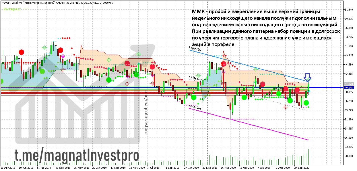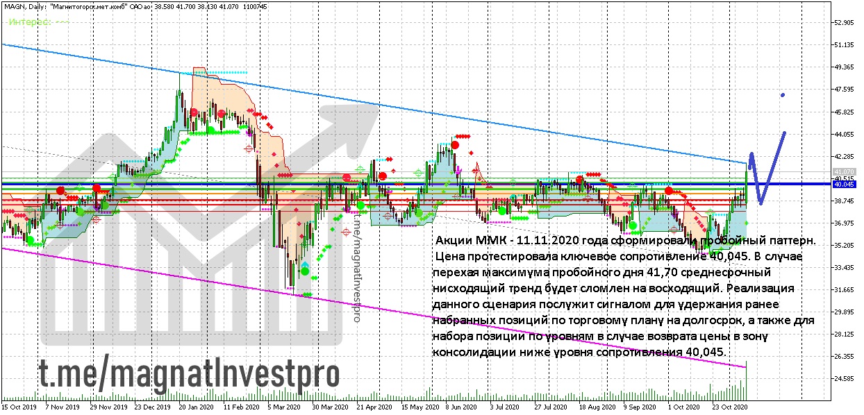 Акции ММК - 11.11.2020 года сформировали пробойный паттерн. Цена протестировала ключевое сопротивление 40,045. В случае перехая максимума пробойного дня 41,70 среднесрочный нисходящий тренд будет сломлен на восходящий. Реализация данного сценария послужит сигналом для удержания ранее набранных позиций по торговому плану на долгосрок, а также для набора позиции по уровням в случае возврата цены в зону консолидации ниже уровня сопротивления 40,045.
